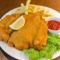Tenera fetta di carne impanata e dorata, arricchita da uno...