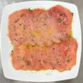 Fette sottili di tonno affumicato e delicatamente marinato, servite con...